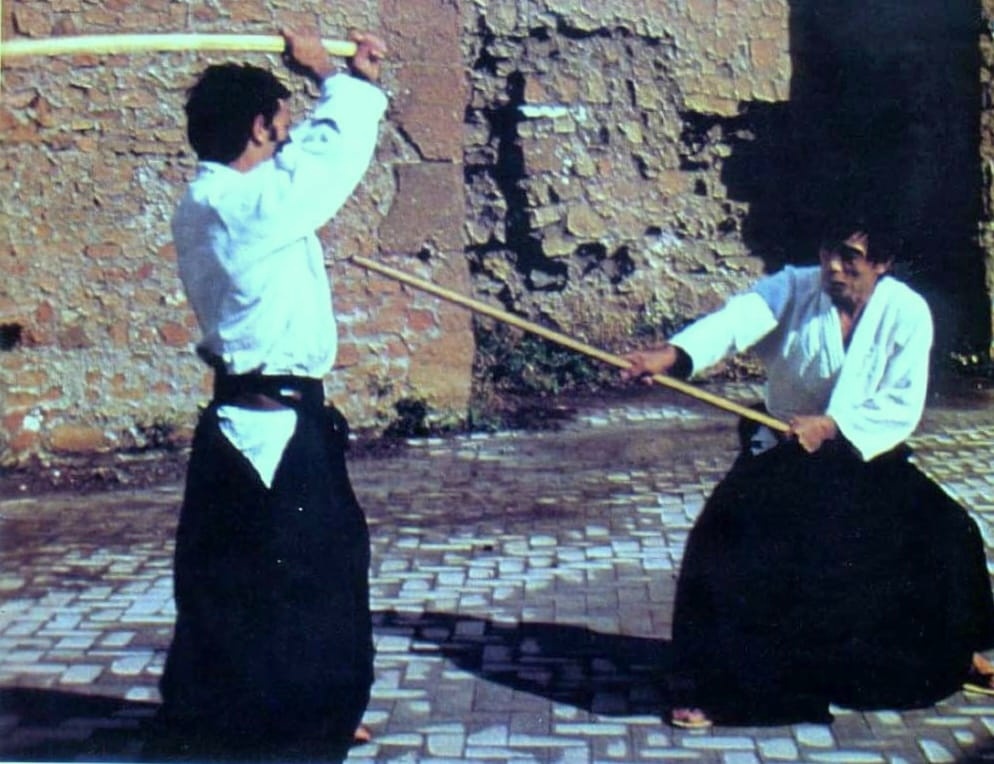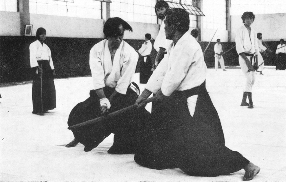 La prima volta che vidi l’Aikido fu ad una dimostrazione di Kobudo. Per l’Aikido c’era il Maestro Tanaka di Osaka. La mia impressione fu quella che di solito provano gli spettatori dei nostri Enbukai: “È tutto falso!” Niente di che quindi. Inoltre i miei interessi erano già interessati sul Kenjitsu e sullo Iaido – li praticava mio nonno; quella sera l’esibizione del Maestro di Iai fu molto bella. Fu eretto al centro della piattaforma un lungo fascio di paglia. Il Maestro, urlando, calò un veloce fendente; la spada attraversò la paglia e giunse in basso, vicino a terra. La paglia rimase per alcuni secondi immobile, come se nulla l’avesse turbata; solo dopo un po’ cadde. Fu un’esecuzione perfetta.
