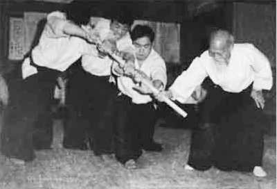 Lo studio dell’integrazione fra Buki Waza e Tai Jutsu intanto procedeva, talvolta in carenza di insegnanti da formare in questo specifico percorso, poiché erano pochi ed infrequenti gli allievi che potevano seguire Morihei Ueshiba in questo suo personale sviluppo.