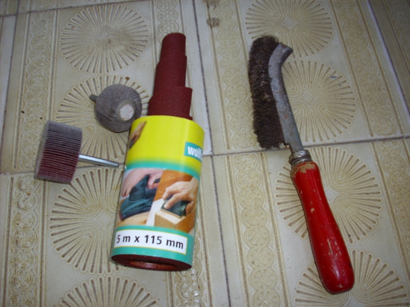 Come appare dalle immagini, la barra di ferro originale presentava una notevole ossidazione superficiale, che ho provveduto a rimuovere con una serie di trattamenti successivi; prima con una spazzola con setole d’acciaio per togliere il grosso, poi con ulteriori passate di carta abrasiva, sino a riportare a vista il metallo pulito.