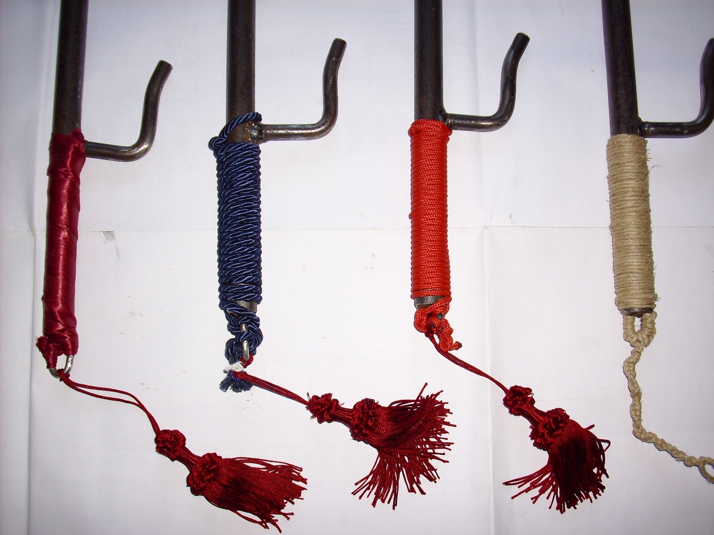 Infine il cordino sintetico, che ad un buon risultato estetico unisce una facile e rapida realizzazione ed una presa comoda. Il tocco finale è stato quello di aggiungere a tutti i jutte (escluso quello con il rivestimento della impugnatura con lo spago di canapa, con cui ho realizzato una specie di “coda” con le estremità degli spaghi stessi) una nappa di passamaneria, simile a quella che tradizionalmente decorava i jutte nipponici.