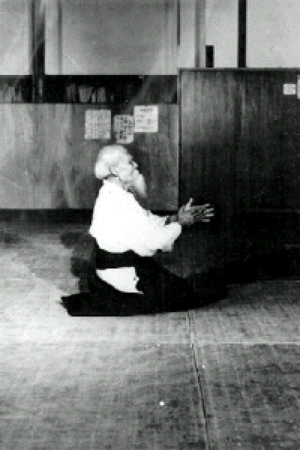 Sì. È successo in questo modo: mio padre si ammalò gravemente nel 1919 e, dopo aver chiesto il permesso a Takeda Sensei mi misi in viaggio, verso casa. Mentre tornavo a casa, mi fu riferito che se uno andava ad Ayabe vicino a Kyoto e dedicava una preghiera, avrebbe ottenuto la guarigione da qualsiasi malattia. Quindi, ci sono andato e lì ho incontrato Onisaburo Deguchi. In seguito, quando arrivai a casa, venni a sapere che mio padre era già morto. Anche se avevo incontrato Deguchi Sensei solo una volta, decisi di trasferirmi ad Ayabe con la mia famiglia e finii per restarci fino alla fine del periodo Taisho (intorno al 1925). Sì… a quel tempo avevo circa 40 anni. Un giorno mi stavo asciugando vicino al pozzo. All’improvviso, una cascata di accecanti bagliori dorati scese dal cielo avvolgendo il mio corpo. Poi immediatamente il mio corpo divenne sempre più grande, raggiungendo le dimensioni dell’intero Universo. Mentre ero sopraffatto da questa esperienza mi resi improvvisamente conto che non si dovrebbe pensare a cercar di vincere. La forma del budo deve essere l’amore. Si dovrebbe vivere nell’amore. Questo è Aikido e questa è la vecchia forma della postura nel kenjutsu. Dopo questa realizzazione ero talmente felice da non poter trattenere le lacrime.