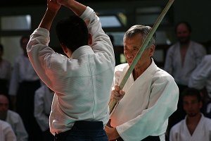 È O Sensei che ha creato l’Aikido. Ed ogni volta che ha mostrato l’Aikido ha usato le armi. Non sta a noi, suoi discepoli e studenti, decidere o no di praticarle. È probabilmente un modo francese di domandare. In Giappone saresti immediatamente trattato da idiota se mettessi questo in discussione. (Ride)
