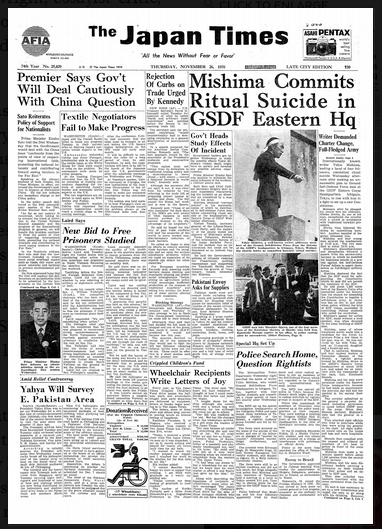 Comincia a leggere e la folla si azzittisce un po’. Poi qualcuno comincia a gridare. “Perché hai ferito i nostri compagni?”, “Gangster!!”, “Scendi e lascia parlare il generale!”. C’è chi continua a urlare: “Sparategli!”. Dopo aver letto il resto del suo appello a una folla sempre più rumorosa, impiegandoci almeno cinque minuti, si ferma. Fa un balzo indietro e, seguito da Morita, torna alla finestra per rientrare nell’ufficio del generale Mashita.”