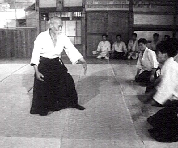 O si ha sempre un corretto impiego di spazio, tempo ed energia da parte di entrambi gli attori, con ciò rendendo reale il conflitto, o non ve n’è da parte di nessuno dei 2, e allora o l’ Uke segue il braccio del compagno come un cagnolino potrebbe seguire il suo osso, quindi con artifici che rendono il tutto irreale, o il castello di vane speranze collassa. E’ per questo che Tori e Uke sono stati momentanei e sempre alternantisi all’ interno della medesima azione. E’ per questo che Morihei eseguiva Ikkyo da tori, prendendo anche l’ iniziativa nell’ attacco (attaccare in fondo non è una parolaccia, significa solo “prendere l’ iniziativa”), come ha fatto notare, un po tardivamente aggiungerei, lo stesso storico dell’ AiKi-Dō Stanely Pranin. Ad esempio nella seguente foto, Morihei va incontro al suo destino, l’ appuntamento, l’incontro con Uke, che diventerà Uke suo malgrado, in questa guerra per la conquista del sen.