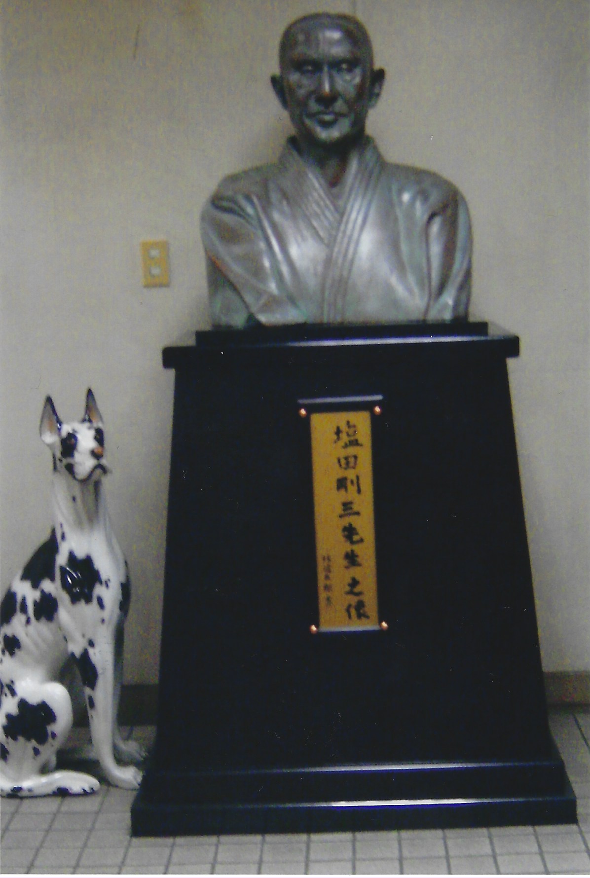 I was i was quite shocked to be honest, because you have an image of what the Yoshinkan Aikido Hombu Dojo might look like and I guess my image of what that place might look like was probably what I found in Iwama, where Ueshiba sensei’s dojo is – you know, a traditional dojo. So, I found my way to Ochiai which i knew is where the dojo is located and I couldn’t find it. It was in an office building and the only clue from the street, if you can imagine a quite busy road, outside the only clue was “ Ai-Ki-Do” in the windows. I remember walking through the very first day, walking into this office building, and I got in the lift (the only time I ever used the lift, because senshusei weren’t permitted to use the lift) and I went up to the second or third floor (depending whether you’re in the UK or the US). I came out to the left and I faced the door to the Yoshinkan Aikido Hombu Dojo. There were two things that struck me: first off the first thing was a big statue of Kancho Gozo Shioda, a big bust, so i knew I was in the right place and the other thing that struck me was the noise, because all I could hear was “Osu! Osu!” and the running of bare feet all around the dojo.