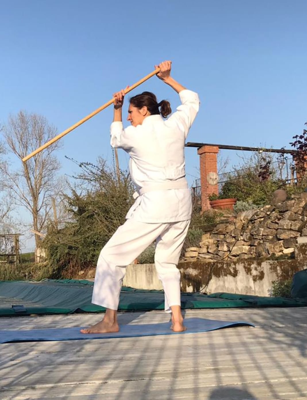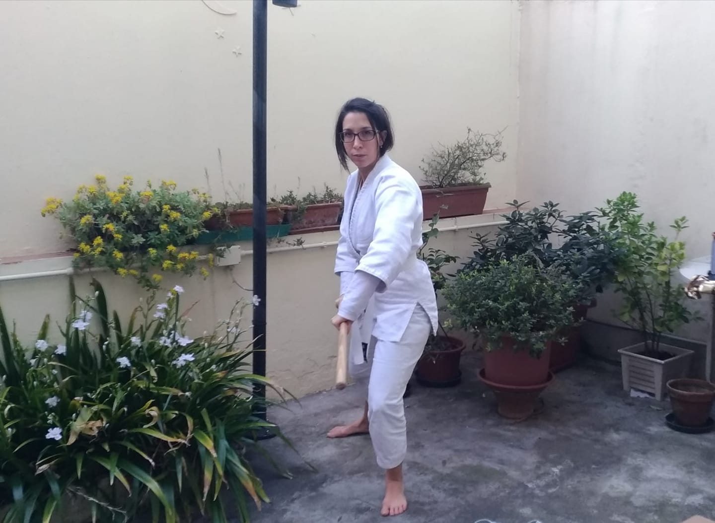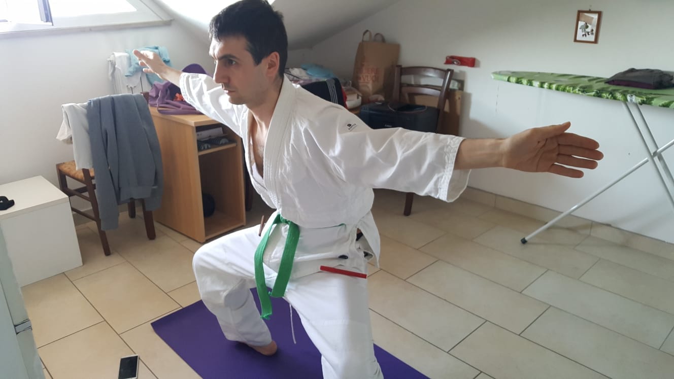 Nel corso della prima lezione ho voluto creare una sintonia con gli allievi cercando per quanto possibile di farli sentire all’interno del mio dojo, ma anche di dare l’impressione che io stesso sarei entrato nelle loro case. Ecco perché mi sono spostato dalla sala al terrazzo al giardino di casa mia, quasi a voler dire: “ragazzi lo so che allenarsi in casa è difficile, ma si può fare. Sono lì con voi!”.