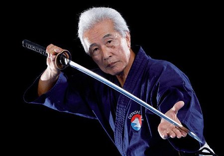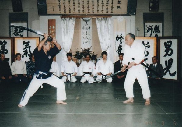 - La partie des armes, dont l’utilisation fréquente par Ō Sensei pour expliquer des principes ou des matrices de mouvement, ou pour renforcer le «corps» de la discipline, est mentionnée à la fois par Minoru et Hiroo Mochizuki sensei [2]. Cette partie, du Yōseikan de Minoru Mochizuki, est confiée aux techniques issues du Tenshin Shōden Katori Shintō Ryū (Épée, Bâton et Naginata, Iai) et du Shindō Musō Ryū (Jō). Présente également des techniques de bâton court (Tanbō, Konbō) et de couteau (Tantō). Mochizuki sensei avait une grande connaissance des techniques d’épée Koryū et Gendai Budō, qu’il utilisait bien;