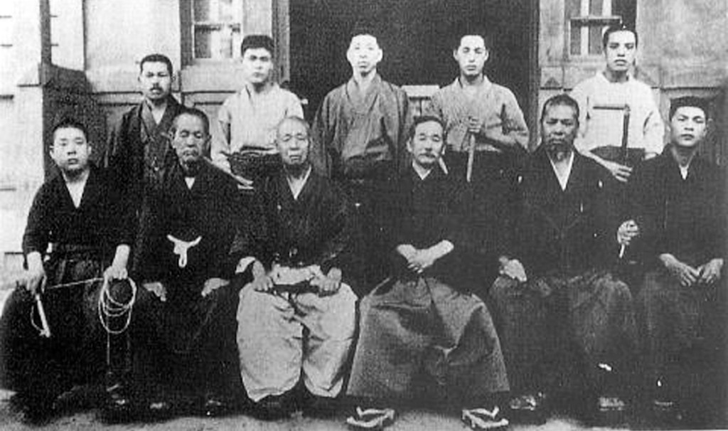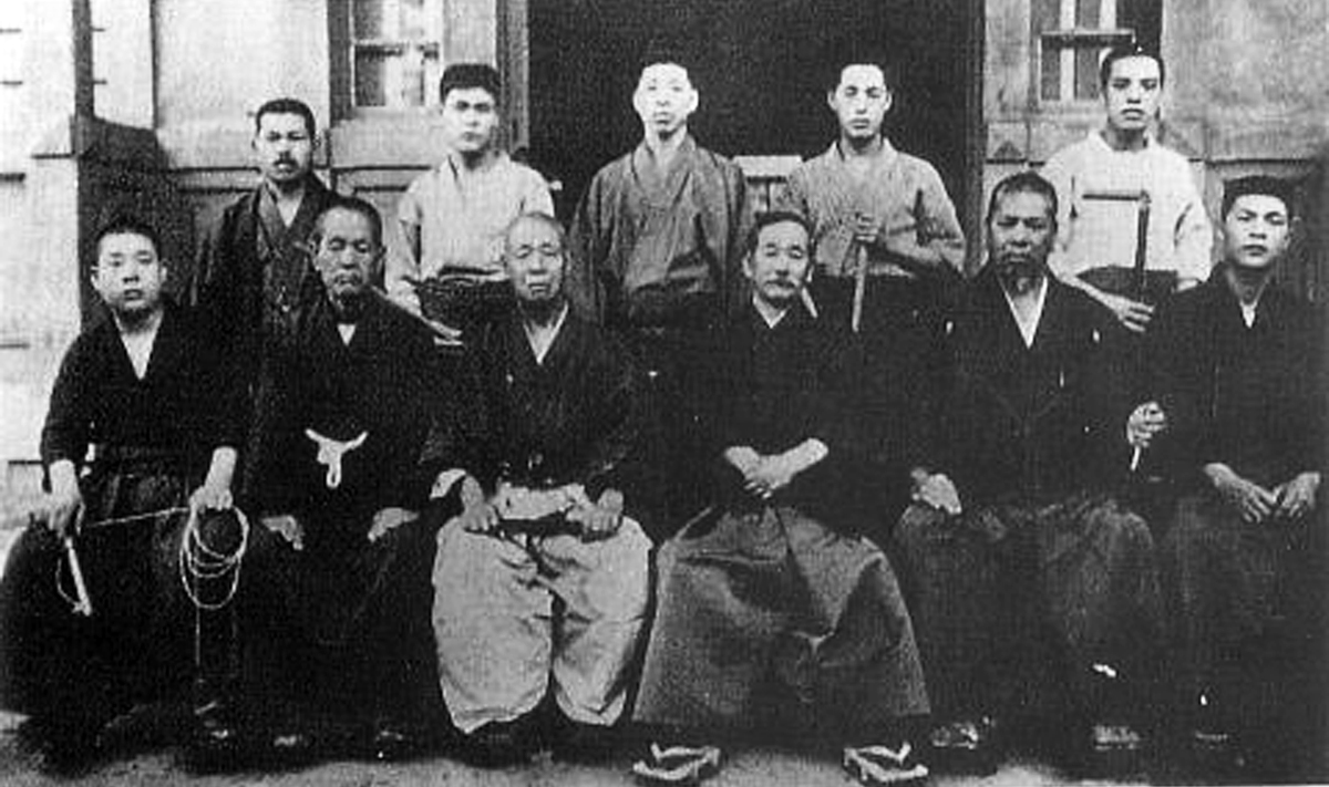 Foto di un gruppo del Kobudō Kenkyukai: in prima fila, a sinistra, un giovane Shimizu Takaji sensei, col Kusari Gama; al centro Jigorō Kanō sensei, ai suoi lati i maestri della scuola Katori Shintō Ryū (mia valutazione: secondo da sinistra Kuboki Sozaemon sensei, poi Tamai Kisaburo sensei, Kanō sensei, dopo di lui Itō Tanekichi sensei e Shiina Ichizo sensei, nella seconda fila, dietro Kanō sensei, un giovane Mochizuki Minoru.