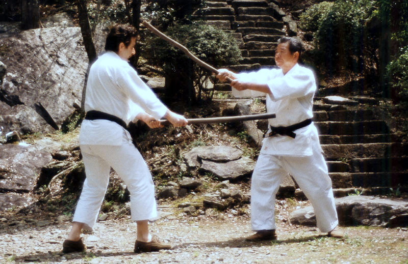 “Before he settled down to cook he gave me an axe and said: ‘Paolo-san, go and cut two branches about this long’, and showed me the length of a bokken. ‘Cut two branches of about the same length and when you’re done come back here’. My friend Gianfranco and I went into the nearby woods and looked for two matching branches, cut them and removed twigs and leaves. I tried to smooth them out as best I could, as sensei instructed me to do. After a while I went back inside the house, I showed them to him and he said: ‘Hai, daijōbu desu! Yes! Okay!’, and asked me to put my keikogi on. I did as I was told and when he came out of the house – I was already outside – with his keikogi on and no hakama, he said: ‘See, I made you cut those branches as the Founder after the war once asked me to do. There was so much poverty around, and the Founder helped many poor families, so at times we even had to make our own weapons. Today I had you do it’. We first started with kumitachi, and then he said: ‘Now we’re going to do ki musubi no tachi!’