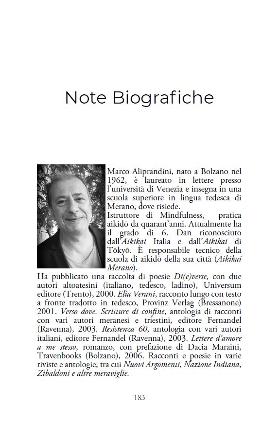 Marco: Prima di tutto ti ringrazio per il tempo che mi hai dedicato, e che hai dedicato a noi. Voglio dirti che questo libro è un libro plurimo, nato come ho giá detto, ma lo vorrei sottolineare, da tutto il dojo, da tutti noi, da tutto il dojo di Merano, l’Aikikai Merano. In questo “noi” ci sono però anche alcune persone che voglio nominare, ad esempio una mia amica giapponese, Yukie Kawaguchi, del dojo di La Spezia del maestro Franco Zoppi, che con pazienza mi ha sempre spiegato ogni parola giapponese e ha scritto la lettera della madre che c’è nel finale. Poi Beatrice Testini del dojo di Padova, maestra di shodo e maestra di aikido, che ha curato con una disponibilità e una gentilezza fuori dal comune la copertina e tutti gli ideogrammi che sono presenti nel libro; e anche l’editore, Simone Chierchini, che è un sognatore, oltre che un maestro di aikido. Vive in Irlanda e pubblica dei bellissimi libri-intervista che riguardano le arti marziali. Ringrazio Simone che ha avuto la pazienza di seguirmi, dimostrandomi affetto e amicizia.