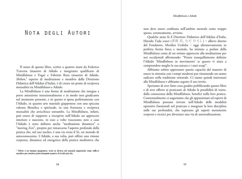 Tratta dal libro “Aikido e Mindfulness” di F. Traversa e F. Ruta, presentiamo la prefazione realizzata da Luigi L. Gargiulo, in cui si evidenzia come esista una reciproca mutualità tra la Mindfulness – la coltivazione della consapevolezza ponendo l’attenzione in modo intenzionale e non giudicante nel momento presente – e l’Aikido, arte marziale giapponese con una spiccata valenza filosofica e spirituale. La Mindfulness può donare all’Aikido un approccio interiore e nascosto, in esso molte volte trascurato. L’Aikido, a sua volta, può offrire una visione corporea, dinamica ed energetica della pratica meditativa che non va confinata, come troppo spesso accade, nell’ambito mentale.